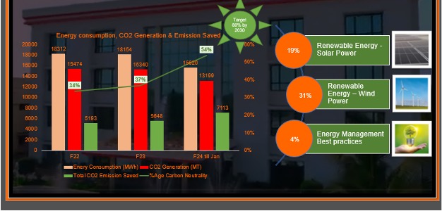 Over the last years, we have been able to significantly decrease our CO2 emissions by reducing the overall energy consumption through more efficient energy management in all plants. In addition, the introduction of solar and wind power covered 19% and 31%, respectively, of our energy needs. Total CO2 emissions saved till January 2024 was about 54%. Our goal in terms of carbon neutrality is to achieve 80% of emission savings by 2030.